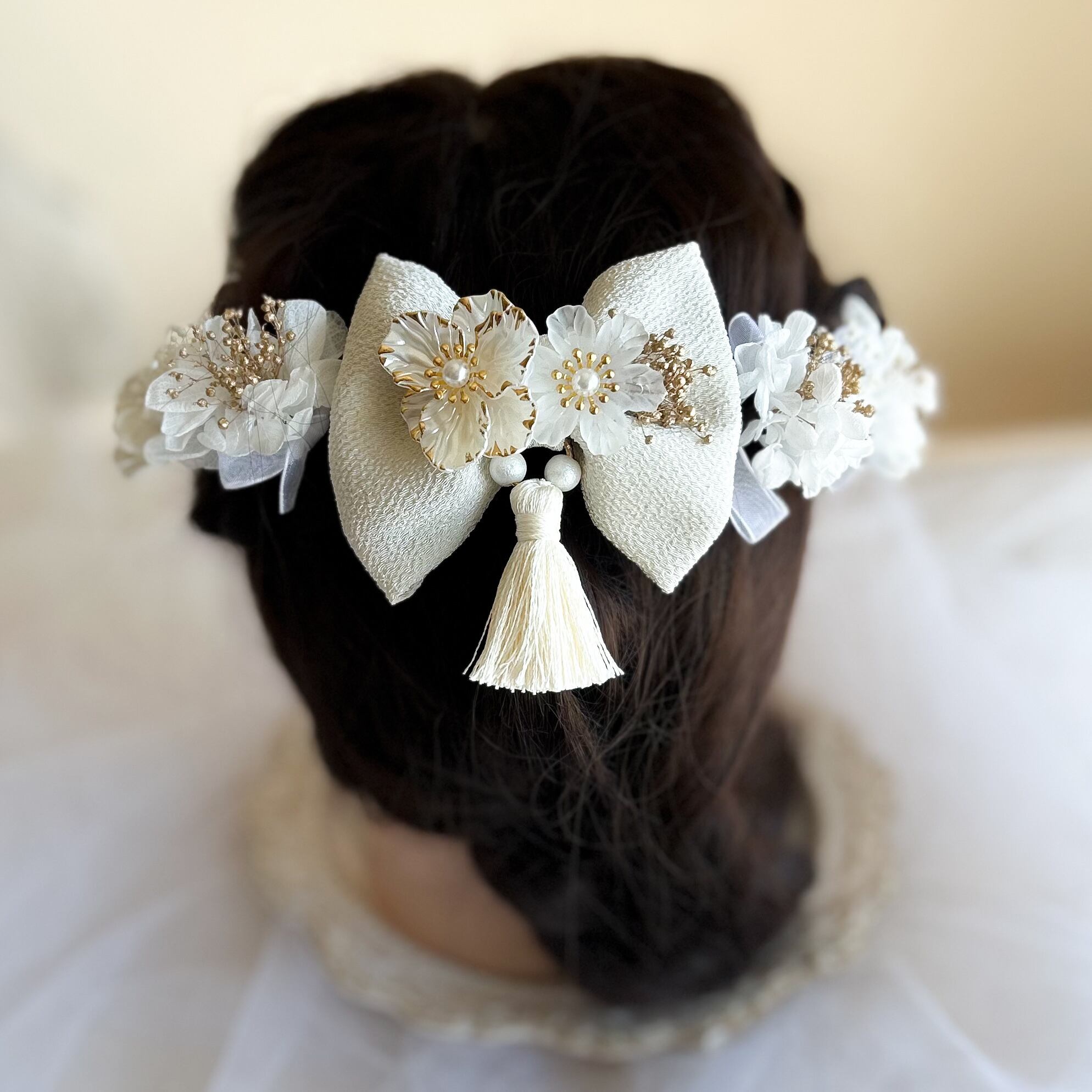 ホワイト×ゴールドカラーのお花の髪飾り